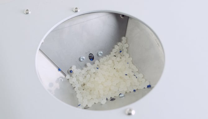 Let the hopper run empty, until there is few to no granulate of the previous material inside the hopper. The image below shows 3devo PLA with blue colorant.