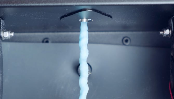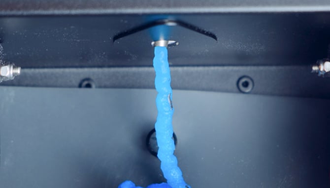 When heated up, MidTemp expands and becomes foamy. Notice the difference between the pile of smooth, blue PLA, and the topmost extruded material. This is MT mixing and pushing out the PLA.