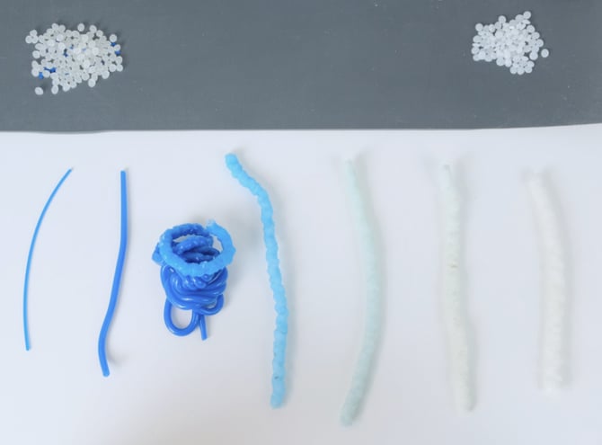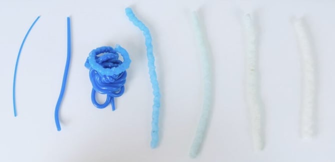 Bottom row from left to right: blue PLA filament purge out by DevoClean MidTemp